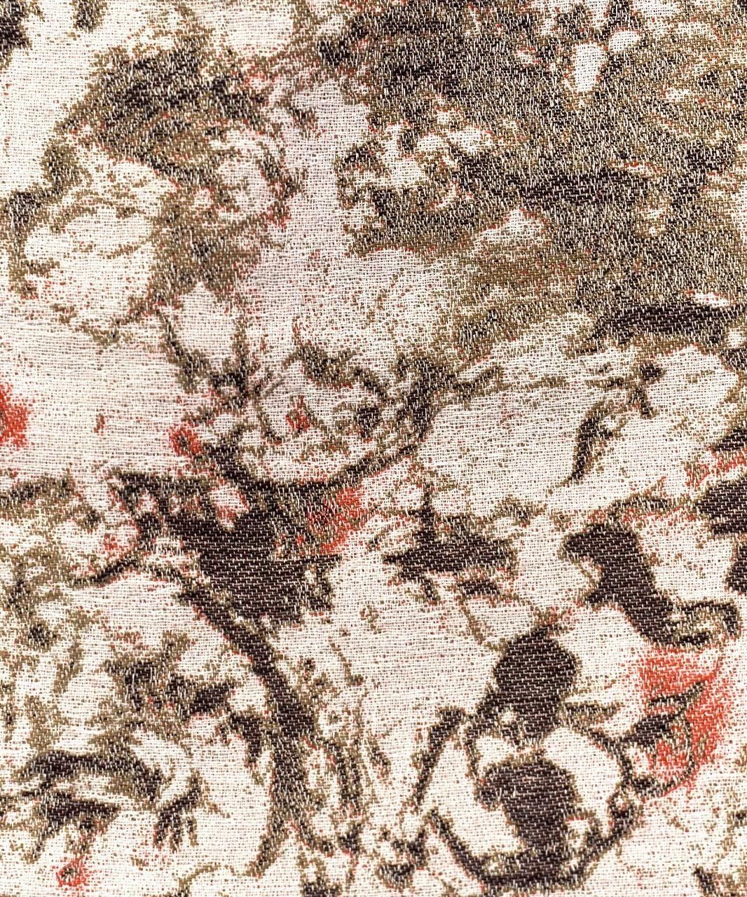 1970年代のフランスの画家の絵からイメージした抽象的な柄をジャガード織機でインディゴ糸を含む縦横共に4色使いで表現したオリジナルファブリック。